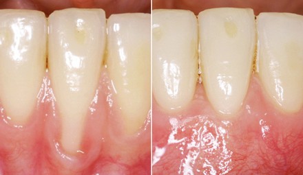 Rezessionsdeckung im Frontzahnbereich, durch Verwendung Bindegewebetransplantation und Envelope-Technik.